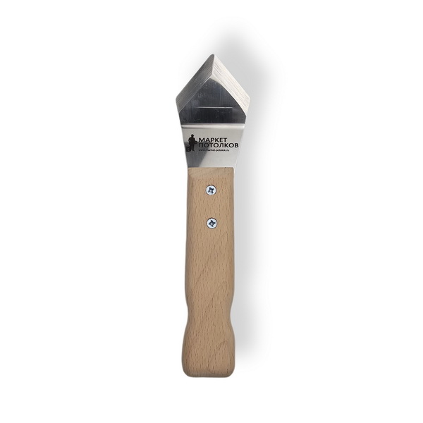 Шпатель для открытого багета. Инструмент с рабочей частью угловой формы. Обеспечивает четкий захват и фиксацию пленки в углах каркаса, применяется для изготовления натяжных криволинейных поверхностей и работы в труднодоступных местах.