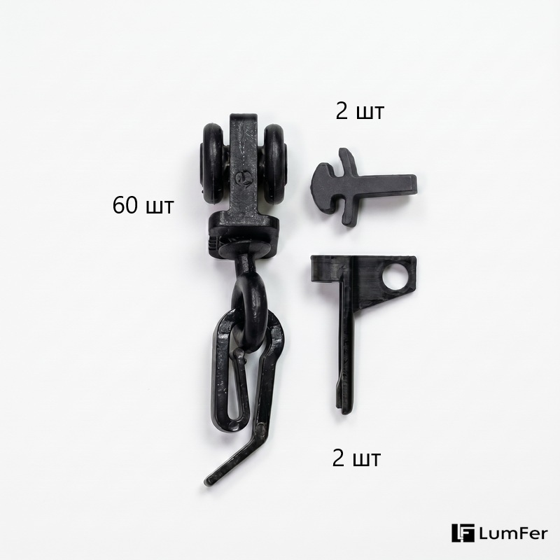 Крючок с бегунком колёсиком (комплект 60 шт) + 4 стопора, чёрный, LumFer