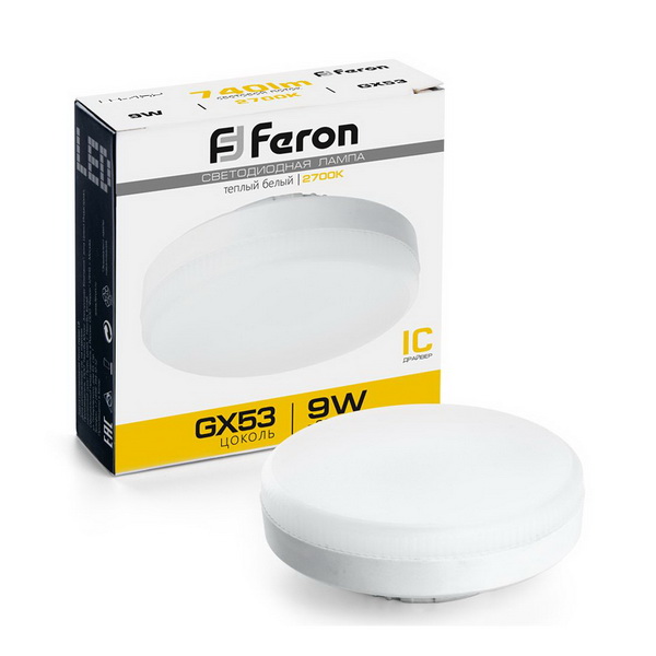 Лампа светодиодная FERON LB-452, GX53 (таблетка), 9W 230V GX53 2700К (белый теплый), рассеиватель матовый белый, 740Lm, угол рассеивания 120°, 26*73мм