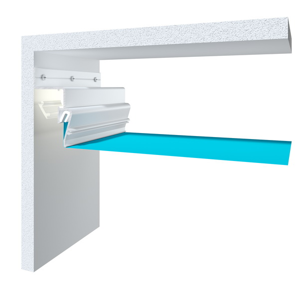 Alteza Contour-Pro Led белый парящий профиль под вставку – предназначен для контурной подсветки натяжного потолка со светорассеивающей вставкой. Ширина контура – 16,5 мм. Применяются светодиодной ленты 8-10 мм мощностью до 14 ватт. Соединение стыковочными гвоздями.