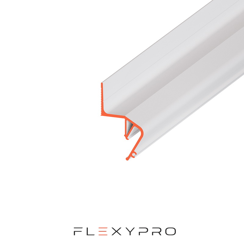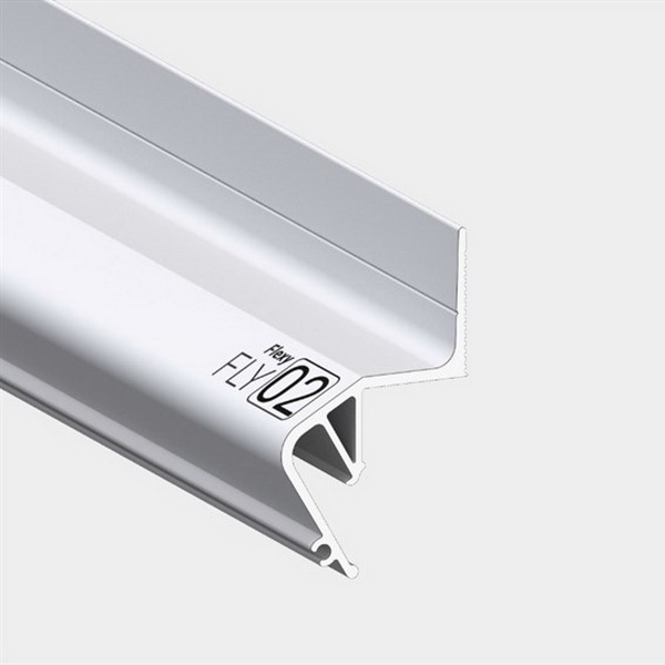Стеновой парящий профиль Flexy FLY 02 для натяжных потолков с гарпунной системой крепления полотна. С полкой для светодиодной ленты и креплением для светорассеивающей вставки.