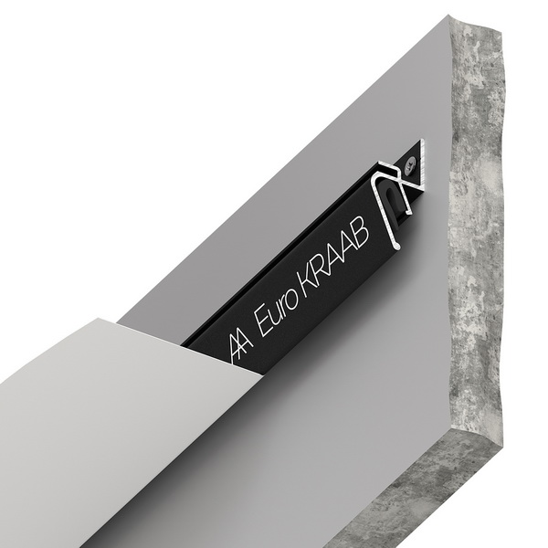 Это дизайнерское решение, которое помогает объединить плоскости стен и натяжного потолка. Благодаря такому методу на стене остаётся правильный, ровный теневой зазор, создаётся ощущение, словно потолок парит в воздухе, совершенно не касаясь стен. Существует несколько модификаций теневого профиля EuroKraab — стеновой, потолочный и усиленная версия для больших площадей (strong)