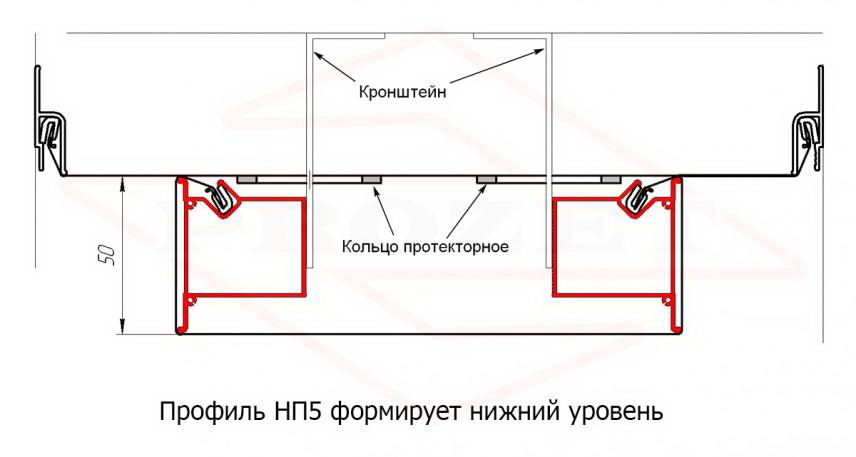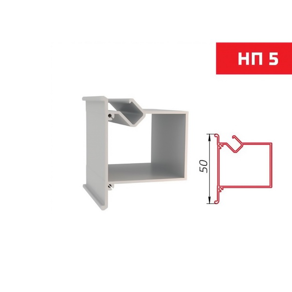 НП 5 — профиль для ступенчатого перехода с подсветкой (нишевой профиль). Предназначен для изготовления каркасов сложных натяжных потолков гарпунной системы с межуровневой нишевой подсветкой. Модель НП5 обеспечивает ступенчатый переход высотой 50 мм.