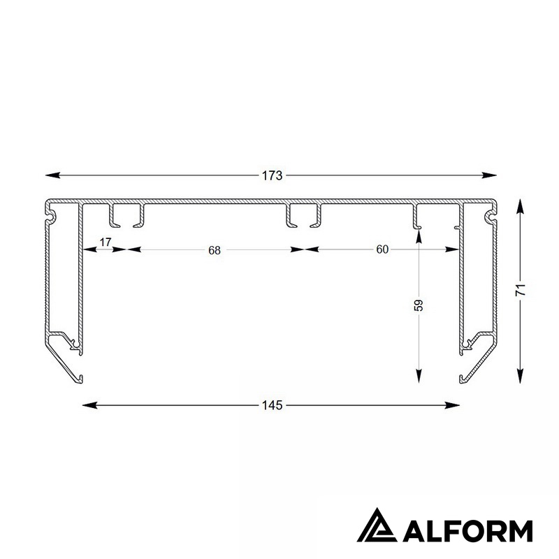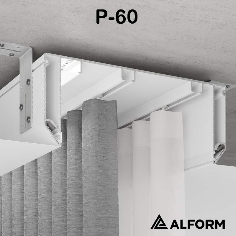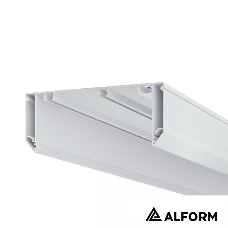 Профиль карнизный GARDINA P60. Алюминиевый профиль для монтажа натяжного потолка на гарпунной системе крепления. Предназначен для изготовления скрытой ниши карниза штор, представляет собой цельнометаллический профиль с двумя рядами для крепления крючков и местом для установки подсветки.