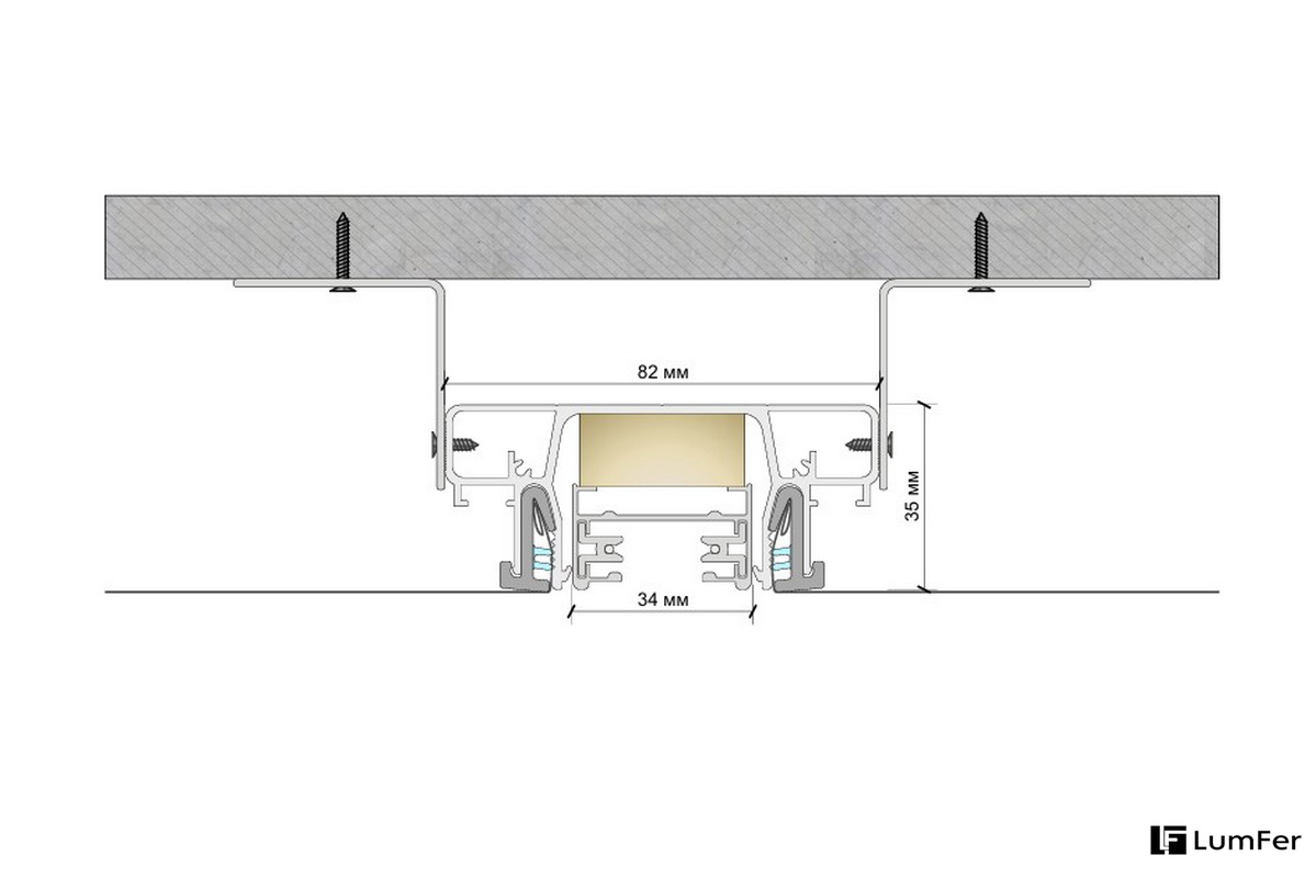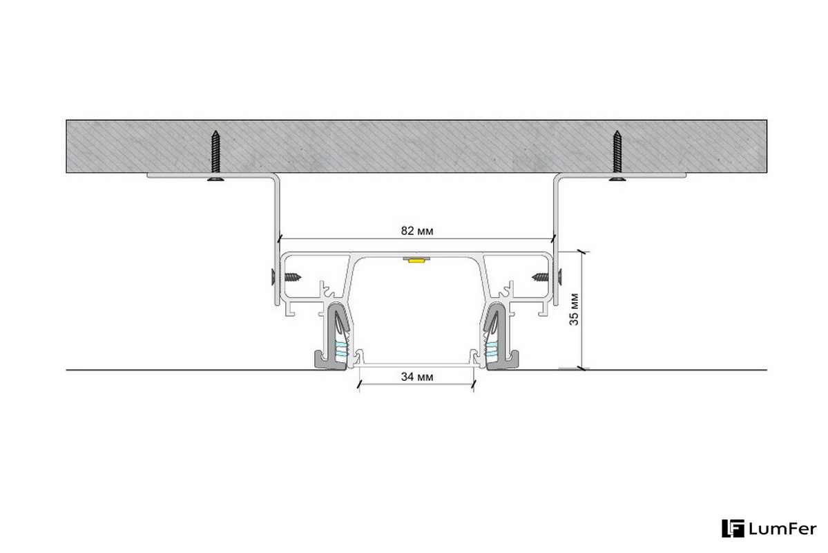 • При монтаже профиля Meduza 35 расстояние от базового потолка до уровня тканевого\ПВХ полотна составит от 3,5 сантиметров.