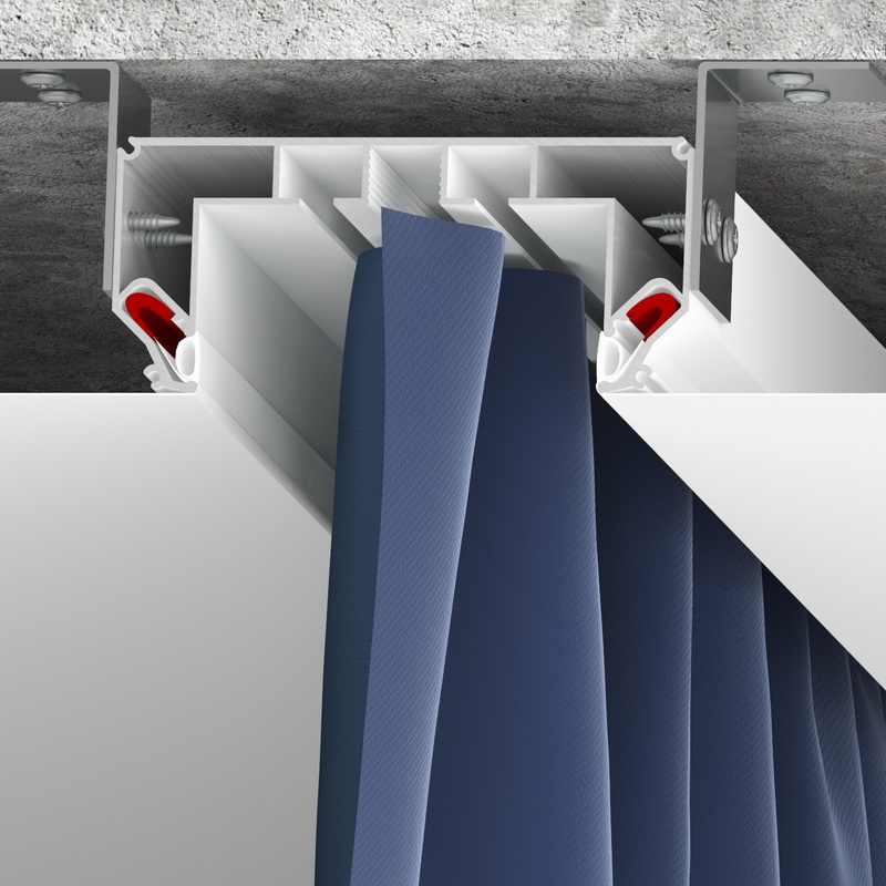 чтобы складки на шторах формировались правильно. Возможна установка светодиодной ленты для подсветки штор, которая направлена вертикально вниз и закрывается рассеивателем. Конструкция профиля предусматривает фиксацию полотна при помощи гарпунной системы крепления. Вертикальный паз для заправки гарпуна закрывается разделительной вставкой.