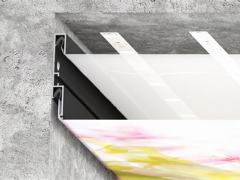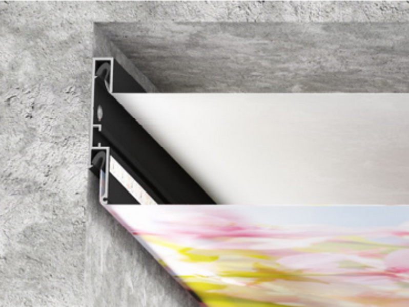 Double LumFer (двойной контурный) – специальный монолитный алюминиевый профиль, особенностью которого является возможность устанавливать 2 полотна на разных уровнях. Профиль применяется в арт потолках, резных и Double Vision, крепится по периметру помещения. Визуальная особенность этой конструкции заключается в образовании теневой зоны по периметру помещения шириной 0,6 см. Таким образом профиль обеспечивает идеально ровный темный контур без установки заглушки по периметру потолка.