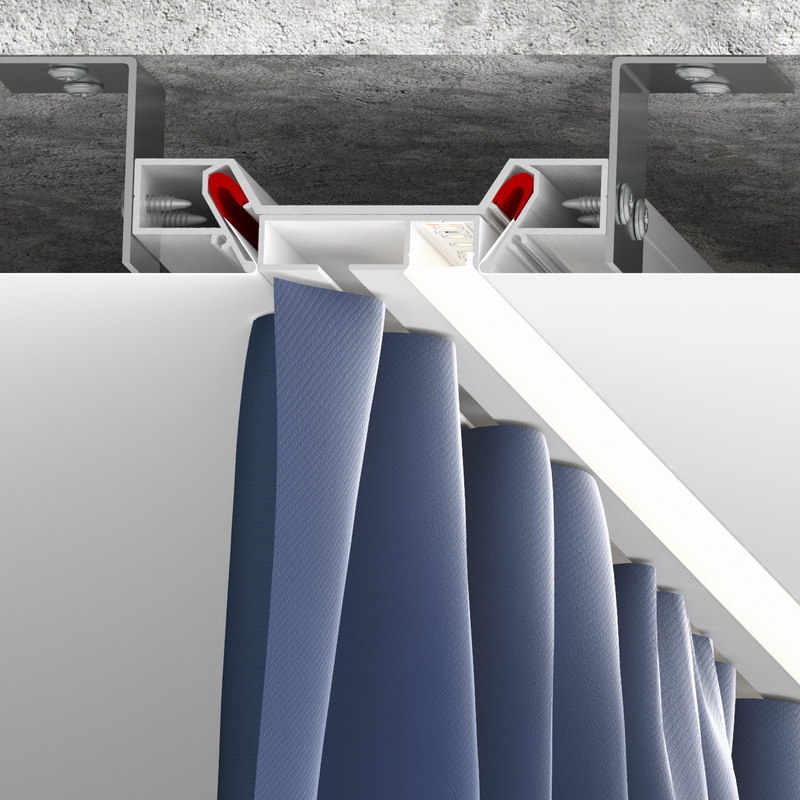Вкладыш VMK01 представляет собой гардину белого или черного цвета с одним рядом для крючков и местом для установки подсветки. Он устанавливается в профиль MK01 и закрывает пазы для крепления гарпуна. Возможна установка светодиодной ленты и рассеивателя для подсветки штор. Освещение от подсветки распространяется вертикально вниз. Конструкция профиля предусматривает фиксацию полотна при помощи гарпунной системы крепления.