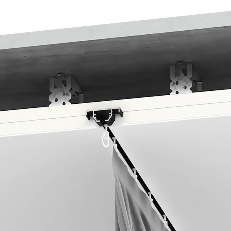 Скрытый карниз ОК 40 – это отличный дизайнерский ход для оформления оконного пространства. Однорядный карниз монтируется вровень с плоскостью потолка — видна только сама шина, по которой двигаются глайдеры.
