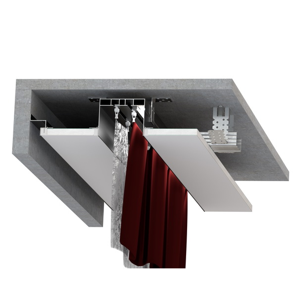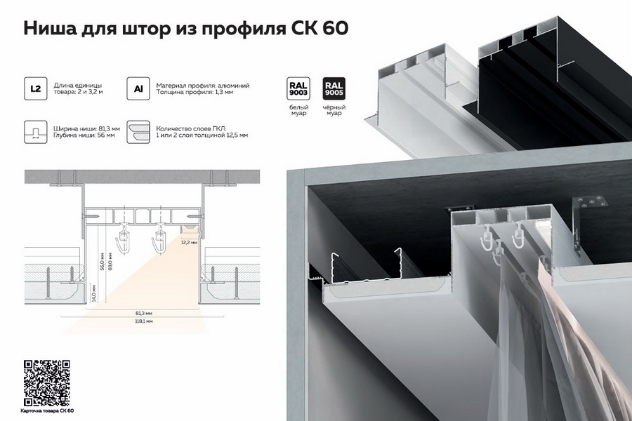 СК 60 визуально представляет собой чёрную или белую нишу в виде прямой линии от стены до стены или с «обрывом». Внутри ниши имеется два ряда, в которых крепятся крючки для штор. Решение позволяет скрыть все механизмы, которые нужны для передвижения штор. Визуально увеличивает высоту потолка и расширяет пространство.