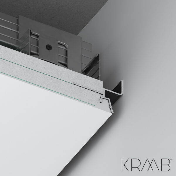 KRAAB GIPPS — теневой профиль с зазором 7 мм. Примыкание к стене под углом 90 градусов. Теневой шов отлично смотрится как на ровных поверхностях стен, так и на плитке, декоративном кирпиче, 3D панелях и других рельефных материалах.