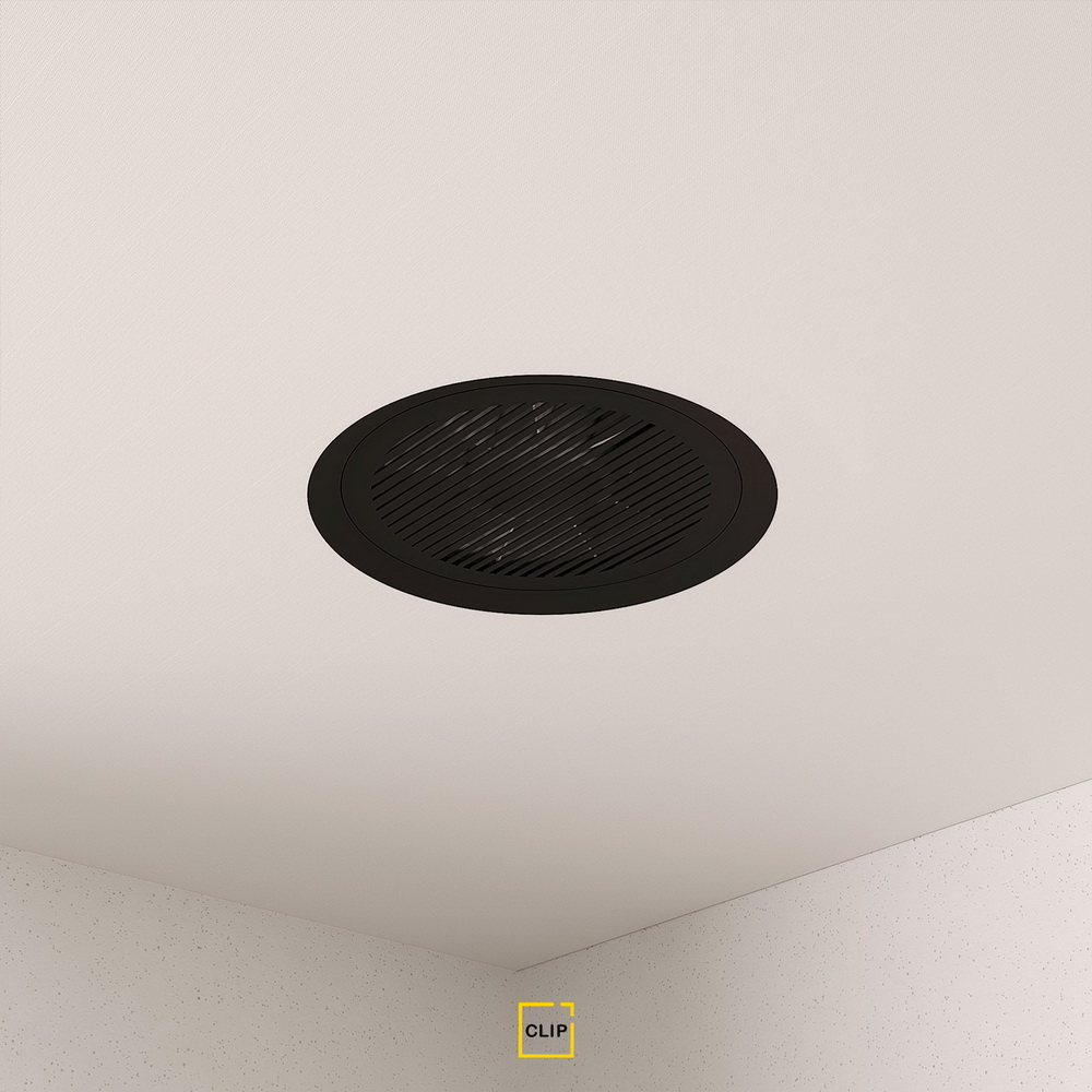 Аккуратный потолочный комплект для скрытой установки вентилятора. Элегантный вариант с линейным I-рисунком. Чёрная магнитная решётка и чёрная вставка создают максимально спокойный и минималистичный вид.