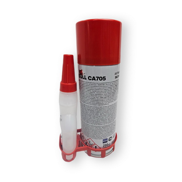 Универсальный экспресс клей Bull с активатором, 50 гр+200 мл CA705 используют для ремонта и надежного склеивания деталей из керамики, стекла, металла, камня, ПВХ, древесины, МДФ, пластмассы, картона, резины или кожи